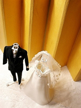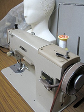 ![]() ![]() ![]() (左)学生の頃から使っている直線縫いのみの足踏みミシン。「小物は結構ミシンを使って作ります」 (中)鶴のボンネと亀のボンネ。「どちらもリボンとビーズで出来ています」 (右)「お客様からのオーダーで、花婿花嫁の衣裳のミニチュアを作りました。 たまにドレスをミニチュアにして欲しいというご要望があります」 |