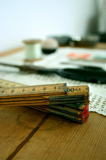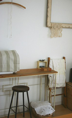 ![]() ![]() ![]() (左)製作時に使う道具類。「基本的に機能重視、古道具ばかりだけど現役で活躍中です」 (中)アンティークファブリックを使ったパッチワークのブランケット。 (右)天然柳のカゴ+パッチワークの巾着は取り外しができる着せ替えバージョン。 |