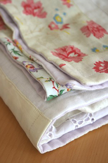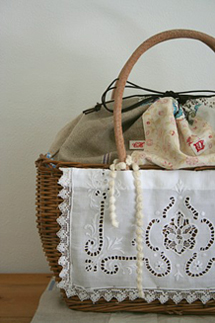 お気に入りのリネンやコットンを中心にアンティークのレースや刺繍素材を取り入れたパッチワークのストールやバッグ、巾着等の布小物作りです。