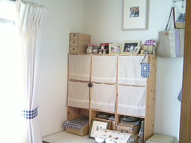 小さなシードビーズやハンドメイド作品を納めている収納棚。