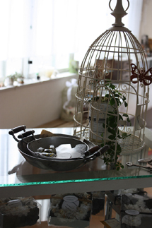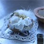 ちいさなお菓子のモールドや空き缶やボトル、木の実など、身近な物を自然の素材、アンティークレースや、きらきら、ふわふわした可愛い物と組み合わせて、おおげさではなくて気負わなくていいもの、雑貨として飾れるもの、花とグリーンでちょっと幸せな気持ちになれるものを作れるよう心がけています。
