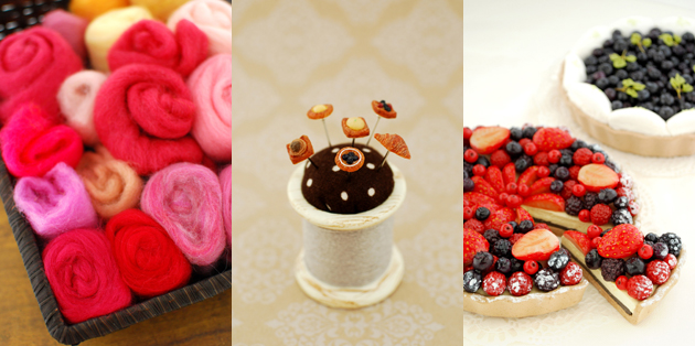 ![]() (左)羊毛フェルト。「この羊毛とニードルがあれば、思いのままに好きなものが作れます」 (中)デニッシュピン。マチ針にミニチュアフードをちょこんと乗せたキュートな作品。 (右)思わず食べてしまいたくなる、フェイクスイーツのフルーツタルト。 |