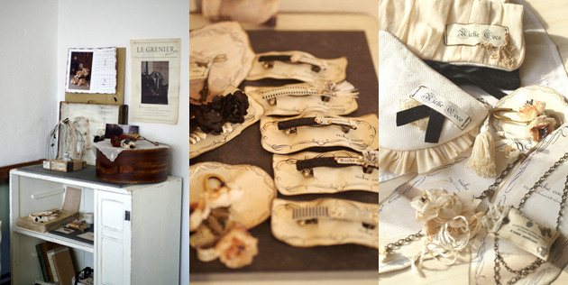 ![]() (左)お気に入りの雑貨などは古道具をリメイクした棚へディスプレイ。 (中)小さくて気軽に使えるアクセサリーを作るのが好き。 (右)シンプルなデザインの中にも上品な雰囲気が漂うように心がけるのが、作品作りのポイント。 |