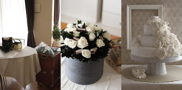 ![]() (左)アトリエ代わりにダイニングテーブルに布をかけて、その上で作業をしたり、リビングのテーブルなどを使用。資材はキャス ター付きのBOXに入れてどこにでも動かせるように工夫。 (中)大好きな白いバラを使ってアレンジ。ゴージャス感を出すゴールドのリボンがポイント。 (右)クレイクラフトの検定作品として作った真っ白なウエディングケーキ。「このとき初めてウエディングケーキを作りましたが、 作成中になんだかとっても幸せな気持ちになりました」 |