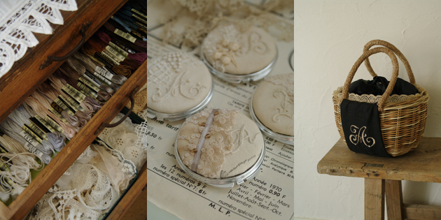 ![]() (左)アトリエにある引き出しの一部。大切な刺しゅう糸やレースはひと目でわかるように。 (中)コンパクトミラー。紅茶で染めたリネンをベースにアンティークな雰囲気に。 (右)アンティークレースと刺しゅうを施したカゴバッグ。シンプルだけど女性らしく仕上げた作品。 |