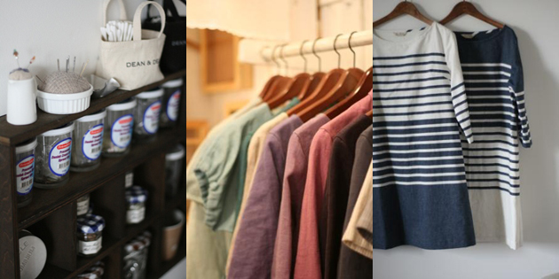 ![]() (左)ボタンやピンを空き瓶に入れて収納。「壁に組み込んだこの棚は板をカットして作りました」 (中)いろいろなカラーリネンを使って制作。 (右)オリジナルの綿麻オックスのパネルボーダーを使ったワンピース。 |