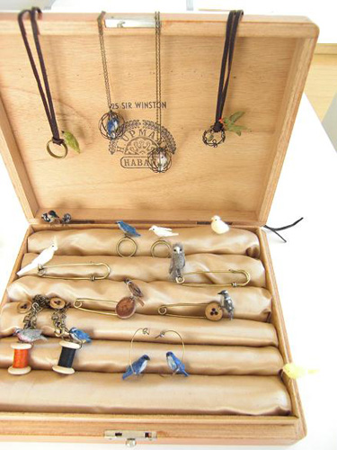 ブローチと、ネックレスと、バッグチャームと、あとは「手紙を届ける鳥」っていうのがあって、鳥が筒状のものをくわえてて、そこに紙がささってて、メッセージを書いて、誰かに贈れるような感じにしています。