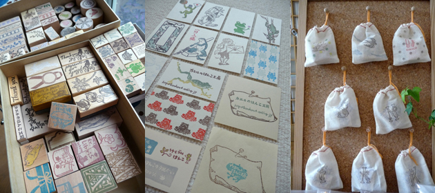 ![]() (左)今まで作りためた作品たち。持ち手をつけると保存しやすい。 (中)「ブログ名どおり、カエルが好きなのでカエルはんこも溜まっていきます」 (右)とあるカフェの雑貨市イベントに出した作品たち。「売れていくのはうれしいけど、ちょっとさみしい気分です」 |