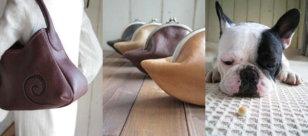 ![]() (左) 渦巻デザインが施されたショルダー。(中) ナチュラルな色合いのがま口。 (右) 看板犬ぷーちゃん。「作業の息抜き時の相棒です」 |
