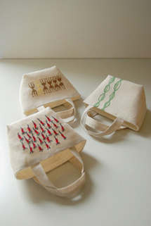 ![]() ![]() ![]() (左)デザイン部屋。最近のお気に入りは本棚に見えるトナカイのAnimal index。 (中)ナチュラルモチーフのミニトート。「清涼感のあるステッチがインテリアのアクセントにもなります」 (右)花ネコのブックカバー。「デザインしている時間がとても楽しいレトロな花動物シリーズです」 |
