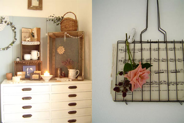 ![]() (左)好きなものを飾っている棚。 (右)お気に入りの雑貨 魚焼き機に古い楽譜を挟んで……。 |