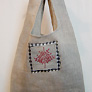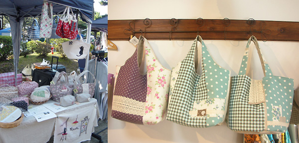 ![]() (左)手作り市に出店したときの様子。 (右)小谷野さんの好きな生地をセンスよく組み合わせたバッグ。 |