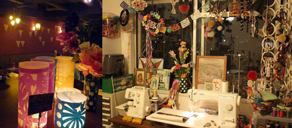 ![]() (左)フリーマガジン「rumblin’」のディナーショーでは、店内装飾で紙のキャンドルホルダーと三角のペナントを手がけた。 (右)二人が愛用しているミシン。デスク周りは、大好きだと語るメキシカンな雰囲気でにぎやかに飾られている。 |