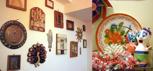 ![]() (左)リビングの壁にはメキシコっぽいテイストがたっぷり。 (右)玄関に飾ってあるのは、メキシコのレスラーをモチーフにした張り子のようなオブジェ。 |