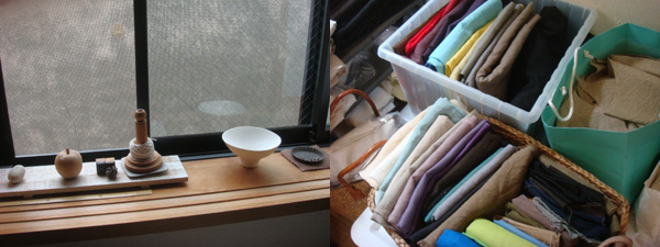 ![]() (左)好きな器やオブジェなど、お気に入りのものを並べたコーナー。 (右)アトリエには生地のストックがたくさん。ネットショップなどで生地を買いそろえているそう。 |