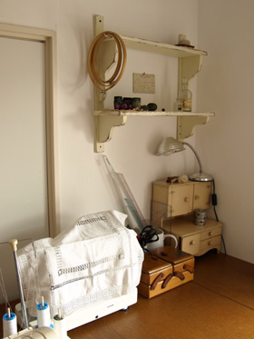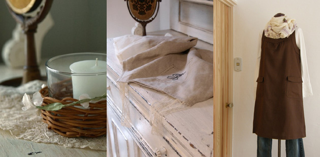 ![]() (左)耐熱ガラスのコップを利用して作ったキャンドルホルダー。「籐とコサージュで飾りつけました。キャンドルの灯と籐の風合 いが好きで毎日愛用しています」 (中)シンプルなキャミソールの胸元にドロンワークとサテンステッチでドイリーのように刺しゅう。「肩ひもにはアンティークレ ースを使って。既製品にはない特別感を出しています」 (右)動きやすい切り替えのエプロンワンピース。「できるだけ作った洋服にはポケットをつけています。これはポケットが大きく て便利な一枚」 |