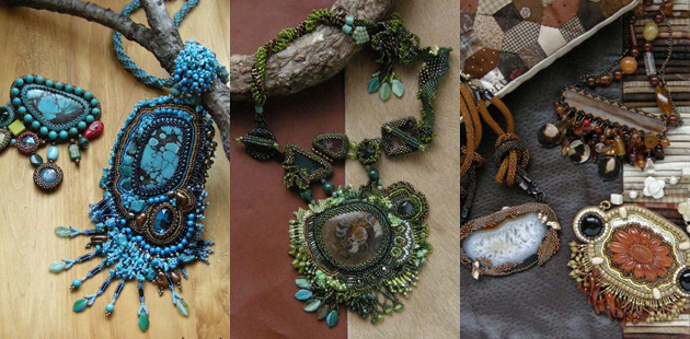 ![]() (左)ターコイズのルースをメインに、ヴィンテージのスワロフスキーやパーツに珊瑚などを使い、デザイン・フリンジにもこだわ って製作。「針職人お気に入りの作品です」 (中)約3億7000万年前のゴニアタイト型アンモナイトと天然石、オフルームステッチの手法も数種類使用。「職人らしいかなり 凝った作品になりました。オリーブグリーンのシードビーズは化石との相性がとてもいいのです」 (右)ブラウン系の布地を集めて製作したパッチワーク作品はグラデーションがポイント。「約2000万年前の木の化石、珪化木や アゲイトに水晶が入った化石シリーズのビーズワーク作品ともよくマッチします」 |