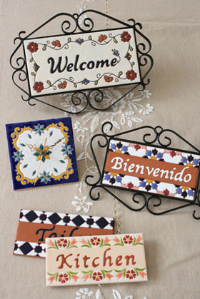 タイルは、そのまま飾ることはもちろん、時計の土台にしたり、マグネットをつけて冷蔵庫のメモ押さえにしたり、ウェルカムボードとして玄関に飾ったり。また、トレーや花台に利用したり、鏡のフレームに配置したりして、日々の暮らしに豊かな彩りを与えてくれるのもうれしい点です。