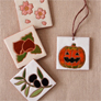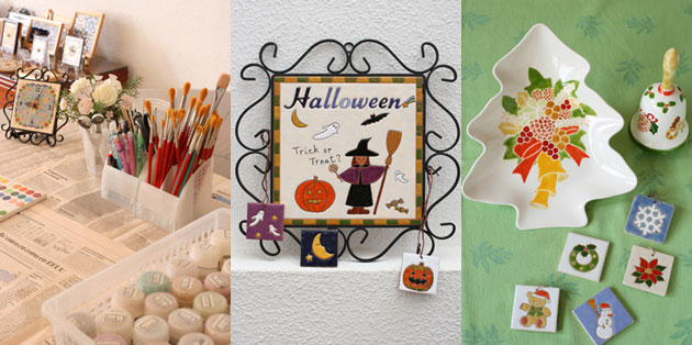 ![]() (左)アトリエ兼タイル教室。「作業中に粉が飛ぶので、机には新聞紙を敷いています。左後方の棚の上は、生徒さんの参考に なるようにタイル作品の見本を展示しています」 (中)ハロウィンタイルのディスプレイ。「20cm角タイルと、5cm角タイルのオーナメントです」 (右)クリスマスのツリー皿とベル、オーナメント。「クリスマスのシリーズは教室でも人気がありますね」 |